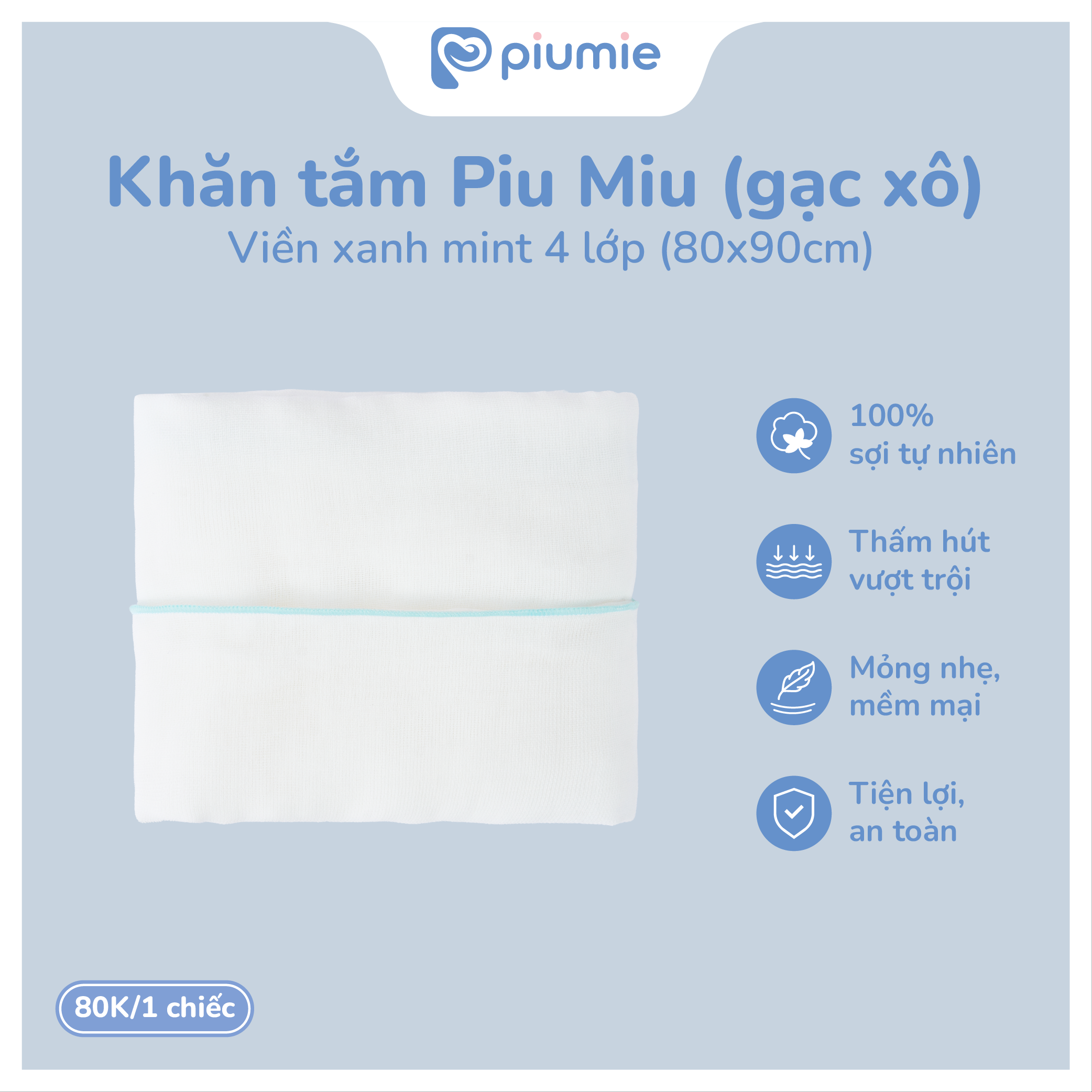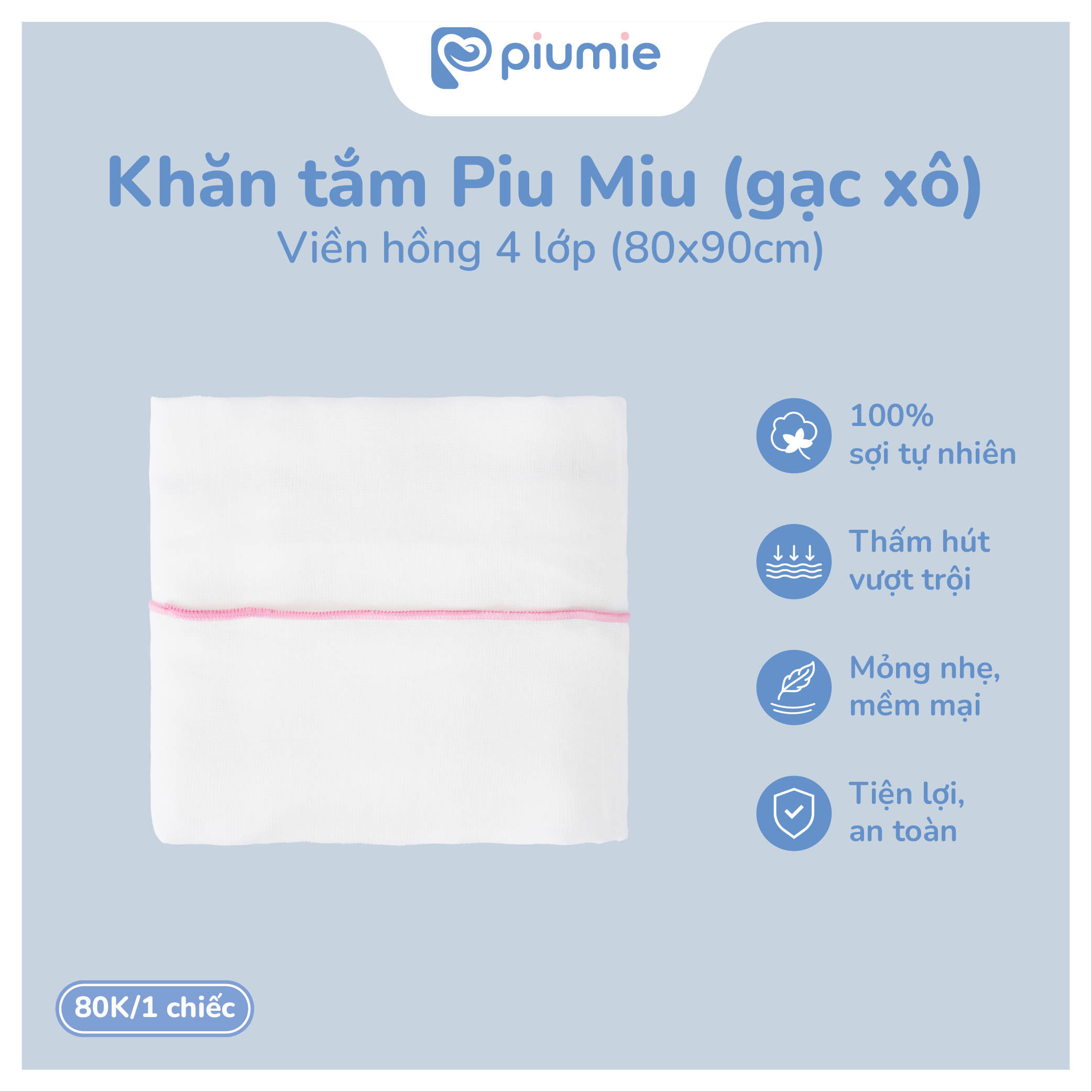 Kích thước là 80x90cm - được tính toán và thiết kế phù hợp cho trẻ sơ sinh. Ngoài công năng sử dụng là khăn tắm thì còn được sử dụng như chiếc khăn lót mềm mại với khả năng thấm hút cao. Khăn gạc xô Piu Miu còn là 1 chiếc khăn quấn ủ cực kỳ an toàn bởi được làm hoàn toàn từ SỢI COTTON CAO CẤP, HẠN CHẾ BỤI VẢI, HẠN CHẾ XÙ LÔNG.