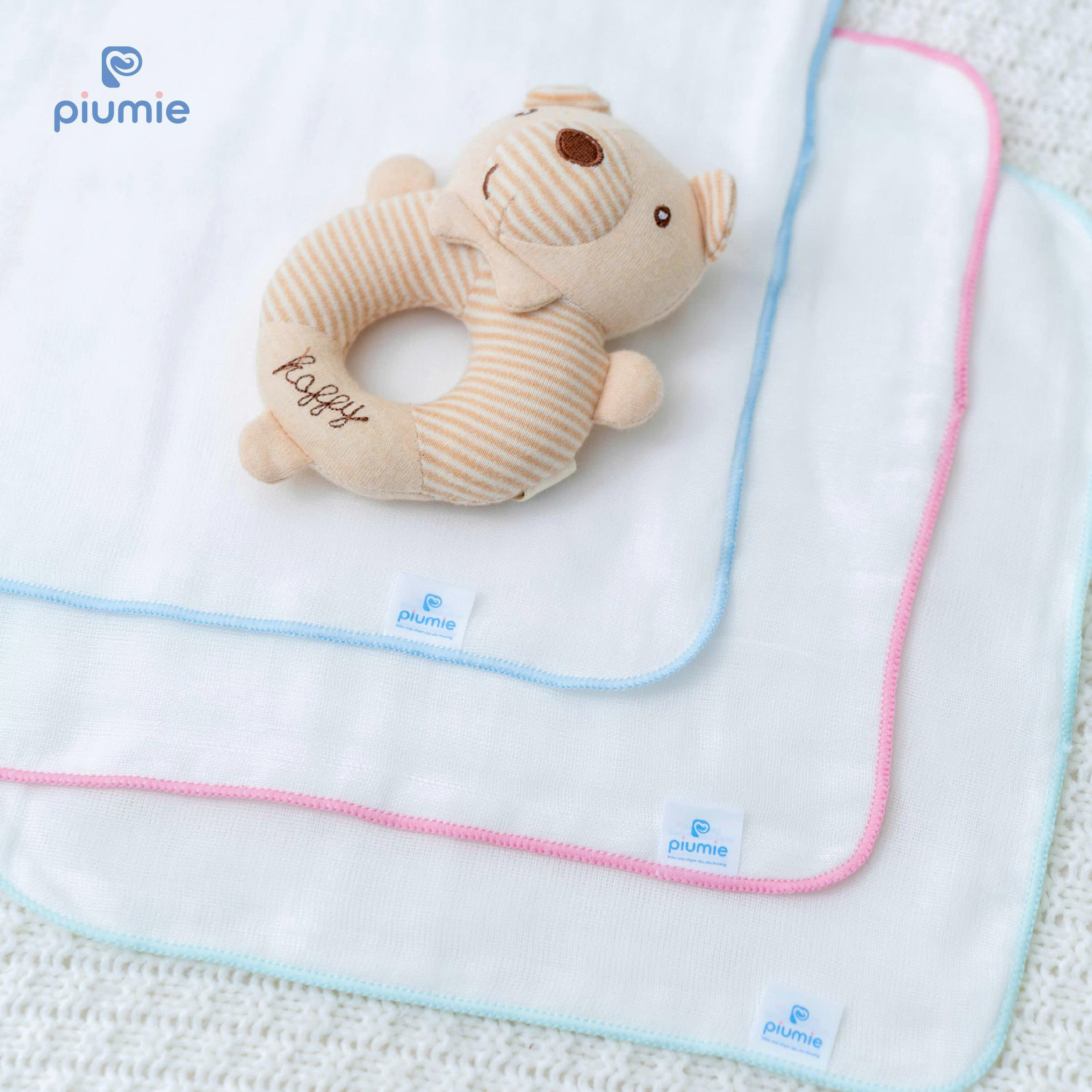 Làm từ 100% SỢI BÔNG TỰ NHIÊN CHỌN LỌC. Các sợi cotton cao cấp được tuyển chọn kỹ lưỡng: dày và dài, giúp khăn bền chắc, ít co rút, bai nhão, giảm xù lông, hạn chế bụi vải, cực kỳ AN TOÀN CHO TRẺ SƠ SINH. Khăn có 3 màu: viền hồng, xanh mint, xanh blue - các đường viền may được Piumie làm hết sức tỉ mỉ, giúp khăn giữ form đảm bảo theo nhiều lần giặt.