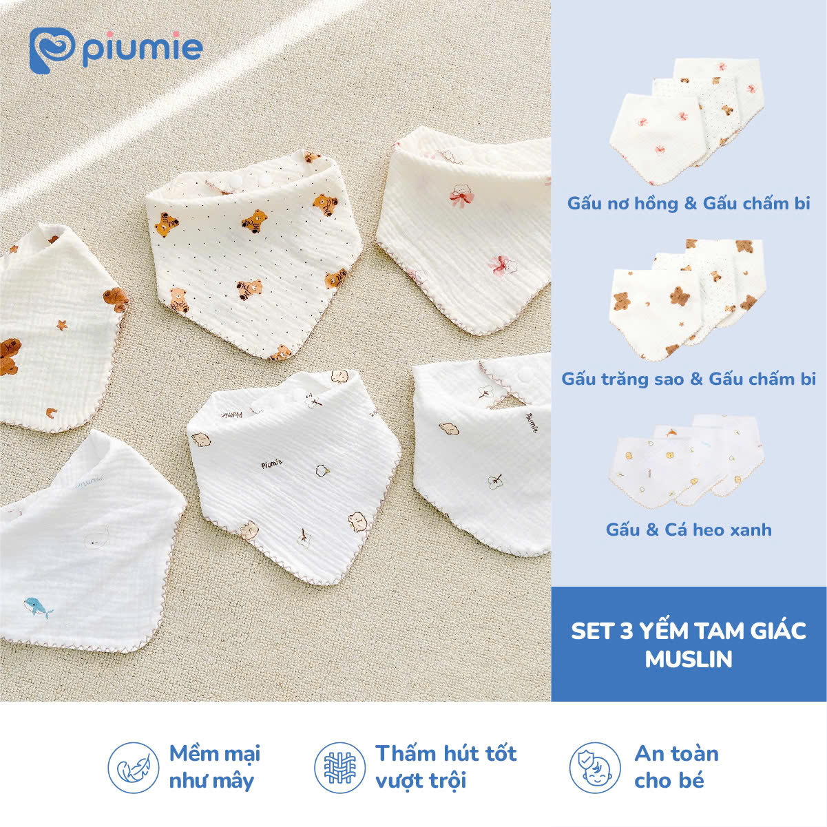 Bộ 3 yếm muslin Piumie: